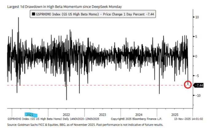 Widać to w danych. Według Goldman Sachs w ostatnich dniach faktor momentum zanotował jedne z najgorszych dni w roku. W zasadzie w zeszłym tygodniu mieliśmy do czynienia z największym jednodniowym spadkiem dynamiki od czasu Deepseek.