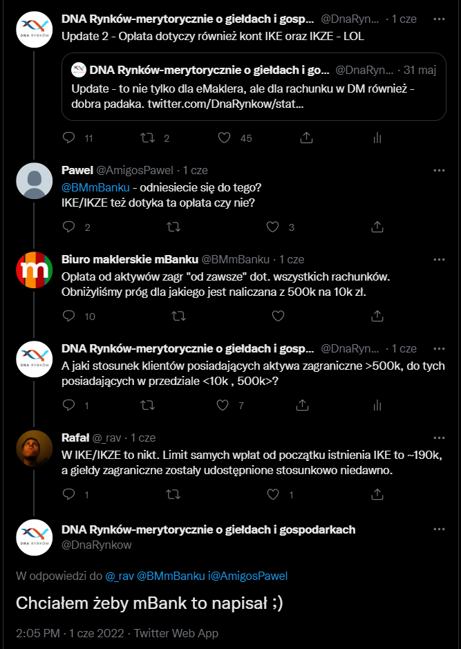 Od 1 lipca 2022 ten próg zostanie jednak obniżony z 500 tysięcy na… 10 tysięcy złotych. O ile posiadanie na rachunku papierów zagranicznych za minimum pół miliona dotyczy raczej wąskiego grona społeczności polskich inwestorów, to już akcje, czy ETF o wartości 10 tysięcy ma o wiele więcej z nich. To też wprost uderzenie w konta emerytalne, bo dotychczasowy skumulowany limit wpłat na IKE i IKZE jest przecież o wiele niższy niż 500 tysięcy złotych. W efekcie tak jak żadne z kont emerytalnych na pewno takiej opłaty dotychczas nie ponosiło. Od 1 lipca 2022 to się zmieni. mBank jak widać poniżej w tej krótkiej wymianie zdań nie kwapił się za bardzo do tego żeby wprost przyznać, że tłumaczenie się tym, że „opłata była zawsze” jest w obecnej sytuacji trochę nieporównywalne.