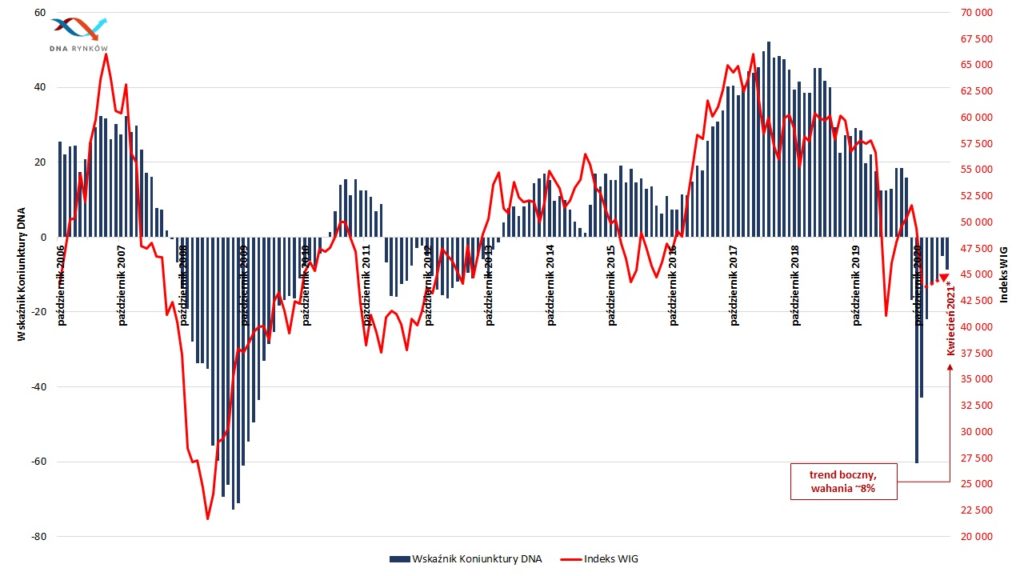 Najnowszy odczyt Wskaźnika znajdziesz poniżej!Materiały DNA Rynków, w szczególności aktualizacje Strategii DNA Rynków, Analizy spółek oraz Analizy sektorów są jedynie materiałem informacyjno-edukacyjnym dla użytku odbiorcy. Materiał ten nie powinien być w szczególności rozumiany jako rekomendacja inwestycyjna w rozumieniu przepisów „Rozporządzenia Delegowanego Komisji (UE) nr 2016/958 z dnia 9 marca 2016 r. uzupełniającego rozporządzenie Parlamentu Europejskiego i Rady (UE) nr 596/2014 w odniesieniu do regulacyjnych standardów technicznych dotyczących środków technicznych do celów obiektywnej prezentacji rekomendacji inwestycyjnych lub innych informacji rekomendujących lub sugerujących strategię inwestycyjną oraz ujawniania interesów partykularnych lub wskazań konfliktów interesów”. Skorzystanie z materiału jako podstawy lub przesłanki do podjęcia decyzji inwestycyjnej następuje wyłącznie na ryzyko osoby, która taką decyzję podejmuje. Autorzy nie ponoszą żadnej odpowiedzialności za takie decyzje inwestycyjne. Wszystkie opinie i prognozy przedstawione w tym opracowaniu są wyrazem najlepszej wiedzy i osobistych poglądów autora na moment publikacji i mogą ulec zmianie w późniejszym okresie.