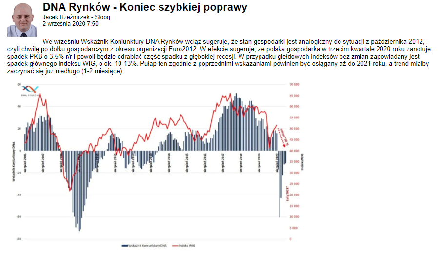 Zapowiadana już w lipcu i sierpniu przez wskaźnik druga jesienna fala spadkowa, jak na razie wypadła niemal idealnie w przewidziany punkt. Warto pamiętać, że jeszcze drugiego września 2020, Wskaźnik Koniunktury DNA Rynków wskazywał na przecenę o pułapie do ok. 45 tysięcy punktów na indeksie WIG w przeciągu najbliższych 2 miesięcy, które mijają dzisiaj. Pisaliśmy o tym chociażby na portalu stooq.pl
