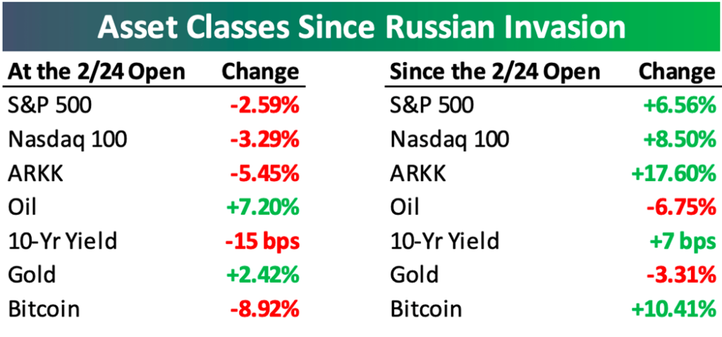 Po lewej poniżej widać, jak otworzyły się poszczególne aktywa w czwartek, gdy Rosja rozpoczęła wojnę. Po prawej widać już z kolei, gdzie te aktywa znalazły się na koniec piątku w dzień po rozpoczęciu inwazji. To zaledwie dwie sesje, w których trakcie rynek zdążył przemieścić się z gigantycznego risk-off, do gigantycznego risk-on.