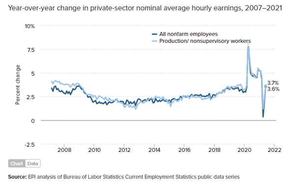 Wzrost płac w porównaniu do roku poprzedniego w USA w latach 2007-2021