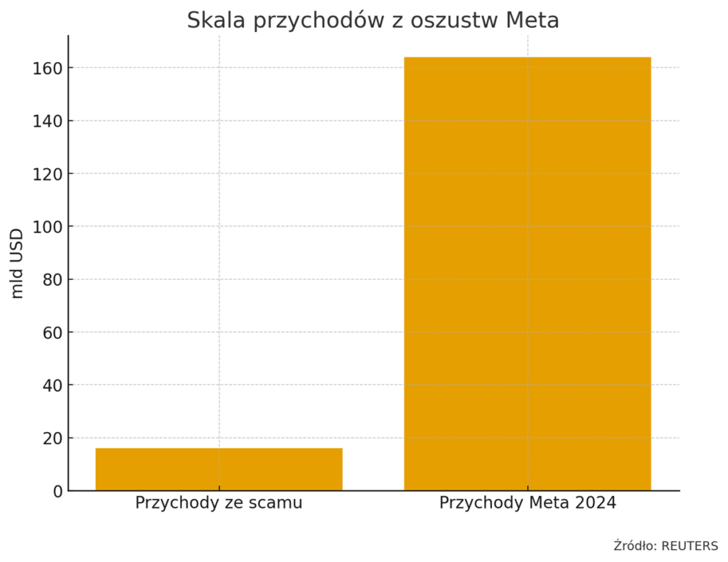 Z drugiej strony widać presję regulacyjną: według materiałów Meta liczy się z karami do 1 mld USD, a w Wielkiej Brytanii regulator wskazał, że produkty Meta były powiązane z 54% strat w scamach płatniczych w 2023 r. Firma miała też wewnętrznie przyznawać, że łatwiej reklamować scam na Meta niż w Google.