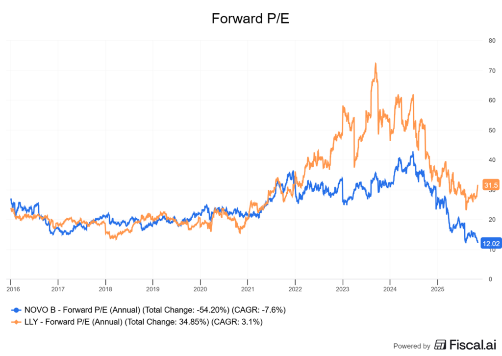 Wyprzedzający wskaźnik P/E dla Novo to dziś około 12x, a dla Lilly ponad dwa razy więcej w okolicy 31x.