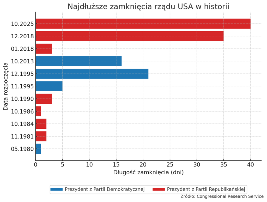 W tle tych wszystkich wydarzeń mamy też już oficjalnie najdłuższe zamknięcie rządu federalnego w historii USA. Obecny paraliż, który rozpoczął się 1 października po tym, jak Kongres nie zdołał przyjąć ustawy tymczasowo finansującej administrację, trwa już 40 dni. To rekord, który przebił nawet słynny impas z lat 2018–2019. Również za prezydentury Donalda Trumpa.