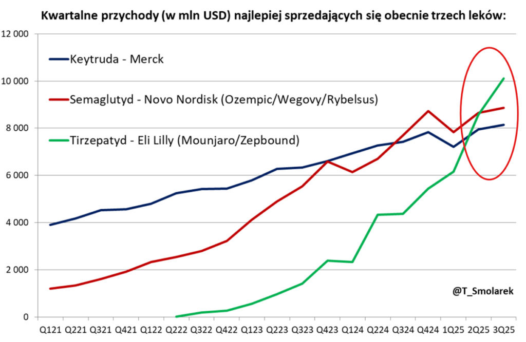 Swoją rolę odgrywa tutaj presja ze strony amerykańskiego konkurenta Eli Lilly, którego leki Zepbound i Mounjaro dynamicznie zwiększają udział w rynku. Na wykresie przygotowanym przez Tomasza Smolarka widać, jak leki Eli Lilly dynamicznie rosną (zielona linia) w porównaniu z Lekami Novo (czerwona linia).