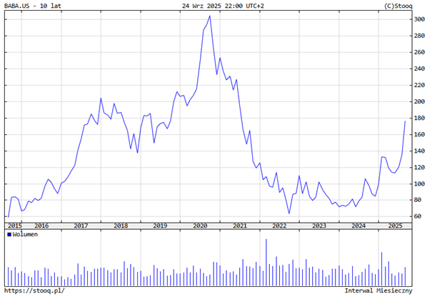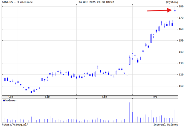 Ale nie tylko oni mają takie plany. Alibaba! Chiński gigant znowu wraca do łask inwestorów. 24 września 2025 roku akcje Alibaby wzrosły o 9% i osiągnęły najwyższy poziom od października 2021 roku. To imponujący skok, który wpisuje się w szerszy trend – rynek wreszcie zaczyna patrzeć na chińskiego giganta technologicznego nie tylko jak na spółkę e-commerce, ale jak na globalnego gracza w wyścigu sztucznej inteligencji i chmury obliczeniowej.