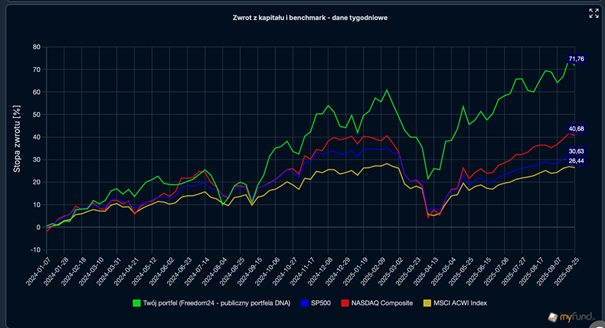 Tak powinien działać i działa dobrze skonstruowany portfel. Naprawdę da się zarabiać na indywidualnych spółkach zagranicznych i bić nimi indeksy w długim terminie. Pamiętajcie, że pełen portfel możecie za każdym razem na bieżąco obserwować na portalu myfund i we Freedom24 znajdziecie dostępne na pewno wszystkie instrumenty, jakie tam są. Przestrzegam, że to ogólnie portfel BARDZO ryzykowny i jeśli ktoś ma niską tolerancję na ryzyko, to absolutnie nie powinno się nim w żadnym stopniu inspirować.