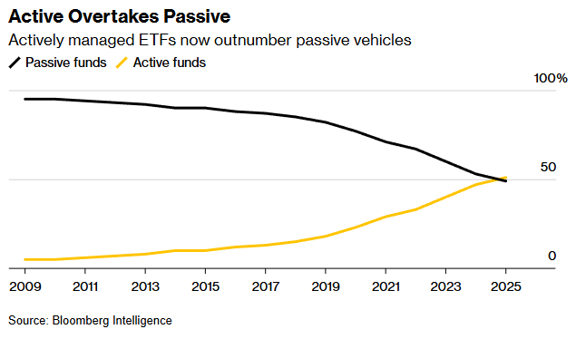 Tylko, że w tle tej rewolucji dzieje się coś pozornie sprzecznego. W USA, kolebce rynku ETF, liczba funduszy aktywnych po raz pierwszy przewyższyła pasywne. Według danych Bloomberg Intelligence, już 51% z prawie 4300 ETF-ów notowanych w Stanach to produkty aktywne. Jeszcze pięć lat temu było to zaledwie 23%. Ten boom nie zmienia faktu, że aktywne ETF-y wciąż odpowiadają tylko za około 10% wszystkich aktywów zgromadzonych w ETF-ach. Jednak to one przyciągają rekordową część tegorocznych napływów – aż 40% całego kapitału, który popłynął do ETF-ów.