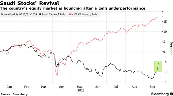 A odchodząc trochę od polityki warto spojrzeć też czasem na totalnie egzotyczne rynki. Ten w Arabii Saudyjskiej dla przykładu przez większość 2025 roku pogrążony w marazmie, a właśnie eksplodował w górę. Na sesji 24 września indeks Tadawul All Share wzrósł o 5,1%. To największy jednodniowy wyskok od 2020 roku. Wartość rynkowa spółek notowanych w Rijadzie zwiększyła się tego dnia aż o 124 miliardy dolarów. Powód? Informacje, że Królestwo Arabii Saudyjskiej zamierza poluzować limity zagranicznej własności w spółkach giełdowych.