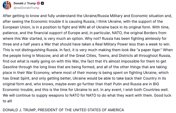 Teraz prezydent USA mówi otwarcie: Putin się przeliczył i sugeruje, że Rosja to „papierowy tygrys”, który coraz bardziej dławi się kosztami wojny, i że czas ponieść cenę agresji. Trump domaga się od sojuszników radykalnego ograniczenia importu rosyjskich paliw i nałożenia nawet 100% ceł na kraje – jak Chiny czy Indie – które zwiększyły zakupy surowców z Rosji po 2022 roku.