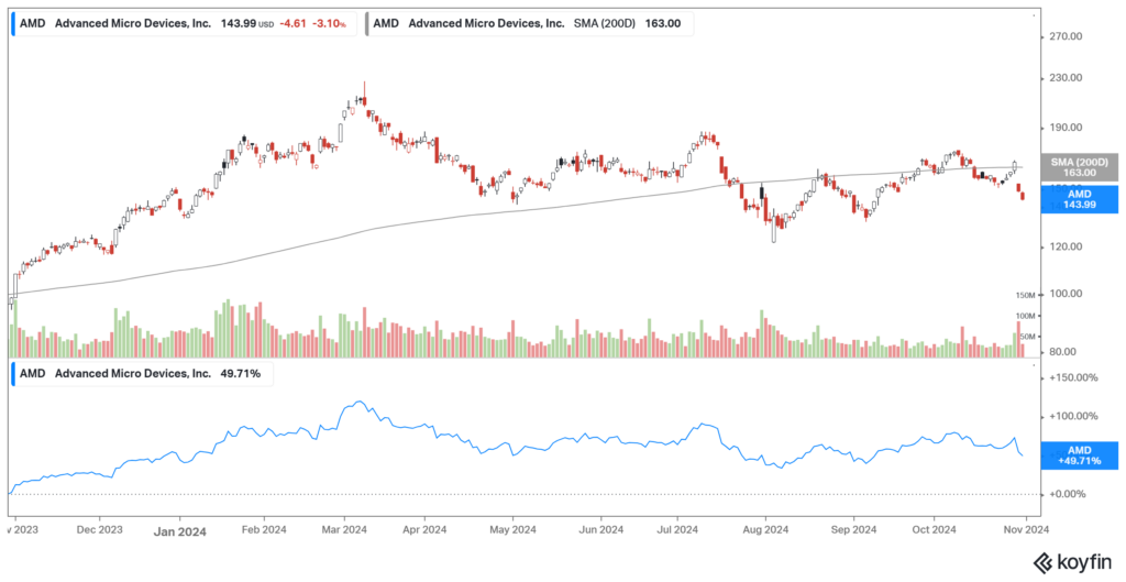 Jednak mimo w ujęciu skonsolidowanym w miarę dobrych wyników za trzeci kwartał, AMD wywołało pewne obawy swoją prognozą na kolejny okres. Firma spodziewa się przychodów na poziomie $7,5 miliarda (+/- $300 milionów) w czwartym kwartale, co oznaczałoby wzrost o 22% rok do roku, ale pozostaje to nieco poniżej oczekiwań rynku, które wynosiły $7,55 miliarda. Realny konsensus był zapewne jeszcze wyżej. Mała różnica, można by rzec wręcz „kosmetyczna”, ale w świecie spółek wzrostowym o takim potencjale jak AMD pozostawia pewien niedosyt.