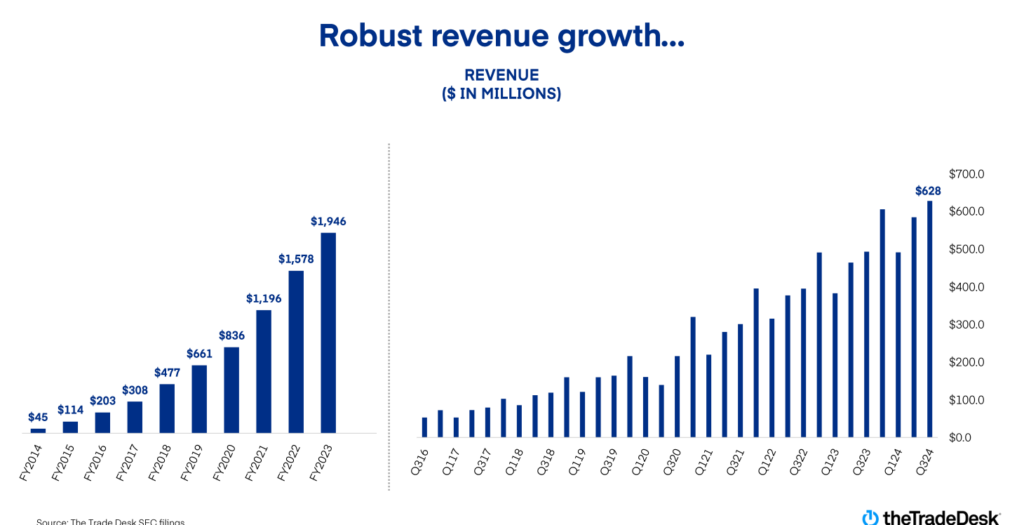The Trade Desk ponownie potwierdziło swoją pozycję wschodzącej gwiazdy w branży reklamy cyfrowej, prezentując znakomite wyniki za trzeci kwartał 2024 roku. Firma osiągnęła przychody w wysokości 628 milionów dolarów, przewyższając prognozy na poziomie 620 milionów i odnotowując wzrost rok do roku o 27%.