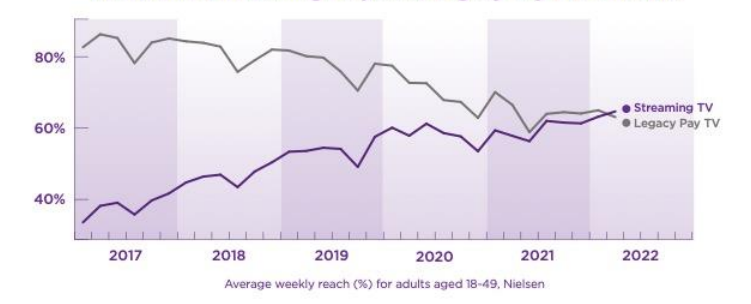 Mało tego po raz pierwszy telewizja strumieniowa przebiła ostatnio swoim tygodniowym zasięgiem telewizję klasyczną w USA. W marcu 2022 65% dorosłych osób (próbka badawcza obejmuje wiek 18 – 49) oglądało telewizję strumieniową, podczas gdy telewizję klasyczną 63% (nie, nie musi się to sumować do 100%, bo możesz oglądać to i to). Wraz ze wzrostem dostępności w streamingu wydarzeń sportowych live pada ostatni bastion klasycznej telewizji. Przykładowo – podczas niedawnego turnieju koszykówki uniwersyteckiej w USA półfinały na platformie Roku oglądało 32% więcej osób niż rok temu. Telewizja klasyczna zaliczyła w tym samym wydarzeniu spadek odbiorców o 10% r/r. Analogiczne dane widać po 64 rozdaniu nagród Grammy. Odbiorcy oglądający je na platformie Roku podwoili się r/r. Klasyczna telewizja zaliczyła spadek o 3% w tym samym okresie.