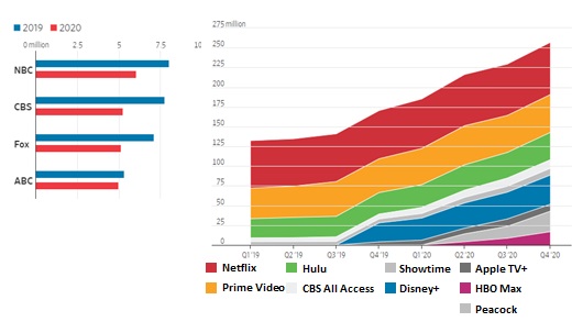 Serwisy streamingowe rosną w siłę. Netflix razem z Prime Video mają już ponad 100 mln użytkowników, a trend jest dość jednoznaczny. Wykres po lewej przedstawia liczbę odbiorców dla czterech największych telewizji USA w najlepszym czasie antenowym w latach 2019 i 2020.
