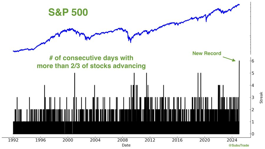 Obecnie na rynkach obserwujemy trzy bardzo pozytywne trendy: poszerzający się rynek, osłabienie dolara oraz spadające rentowności. Warto dodać, że dzisiejszy dzień będzie szóstym z rzędu, kiedy ponad 2/3 spółek z S&P 500 odnotowuje wzrosty – pierwszy taki przypadek od ponad 30 lat!