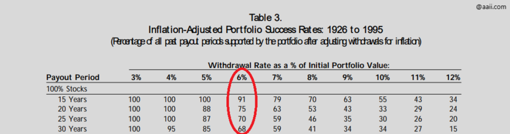 W każdym razie, jakie są wnioski z tego badania? Dla portfeli zbudowanych w 100% z akcji, wszystkie przetrwały 30 lat, jeśli ograniczyliśmy nasze wypłaty do 3% kapitału początkowego. Przy 4%, po 30 latach już jedynie 95% portfeli przetrwało.
