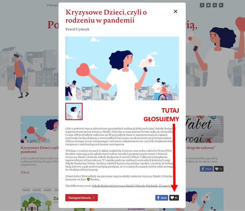 Jak można głosować? Wystarczy wejść na stronę: https://solidarnizwyciezymy.pl/?story=336, która będzie wyglądało jak poniżej i kliknąć serduszko przy głosowaniu. Tylko tyle 🙂
