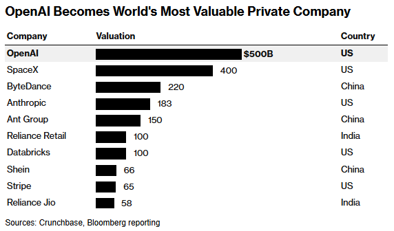 Do tego OpenAI wyprzedziło SpaceX i zostało najcenniejszą prywatną firmą świata. 500 miliardów dolarów. Robi wrażenie.