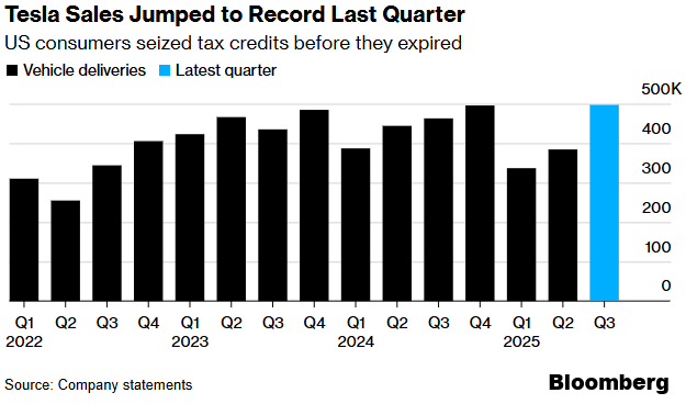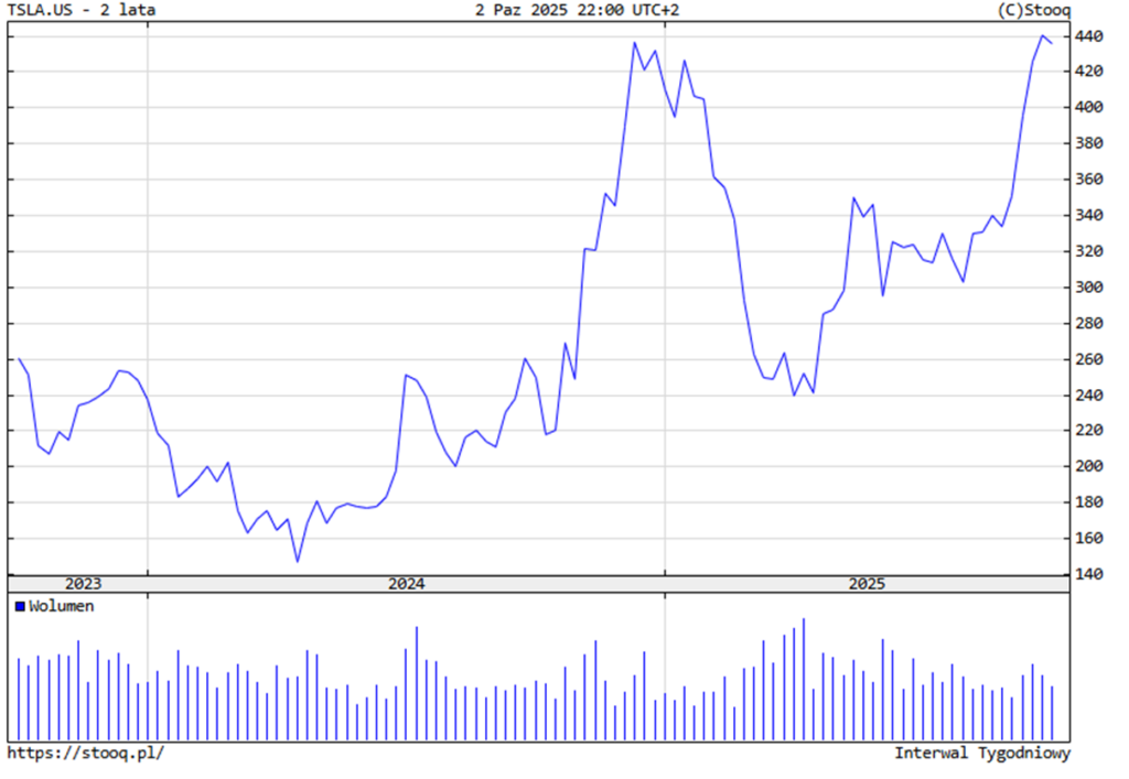 Może np. w końcu akcje Tesli, o której pisałem jeszcze jak była połowę tańsza… Wszystko układa się dla firmy Muska coraz lepiej. Po trudnym początku 2025 roku Tesla dała kolejną serię dobrych wiadomości. Zanotowała w ostatnim kwartale rekordową sprzedaż blisko 497 tys. samochodów, czyli o 7,4% więcej niż rok wcześniej. To wynik zdecydowanie lepszy od oczekiwań analityków, którzy spodziewali się około 440 tys. sztuk. Widać, że tempo spadków, które przez pierwsze pół roku sięgało kilkunastu procent, zaczęło hamować, a sprzedaż wręcz odbiła.