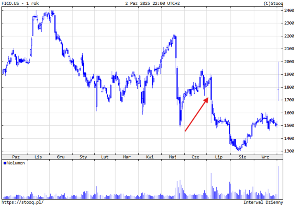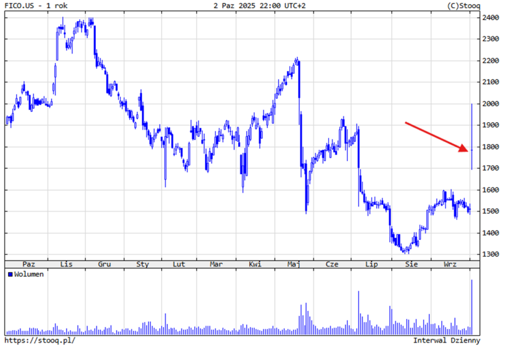 Inwestorzy ocenili tę zmianę jako prawdziwy game changer. Spółka nie tylko odpowiada na presję regulatorów i oczekiwania klientów, ale też wzmacnia swoją kontrolę nad całym łańcuchem wartości w rynku kredytowym. Efekt? Historyczny wystrzał kursu – akcje FICO w czwartek wzrosły intraday aż o 32%, by zakończyć sesję na poziomie +18%. To największy jednodniowy rajd w historii firmy i jednocześnie sygnał, że rynek wierzy w skuteczność nowej strategii. Mimo to ceny są na poziomach z lipca tego roku, a do ATH jeszcze sporo im brakuje.
