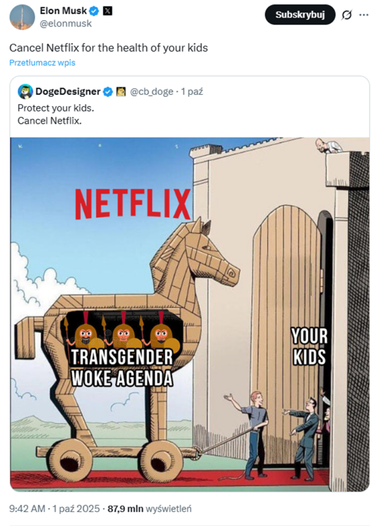 | Elon atakuje Netflixa | https://dnarynkow.pl/w-co-gra-elon-musk-globalna-wladza-i-konflikty-z-politykami-chce-byc-prezydentem-swiata/ |